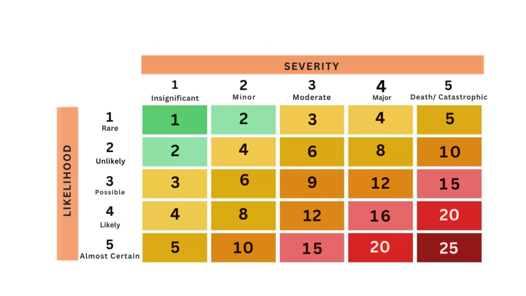 After identifying hazards and affected persons, the next step is to evaluate the level of risk. This is commonly done using a 5 × 5 risk assessment matrix, which assesses risk based on two factors: likelihood and severity.